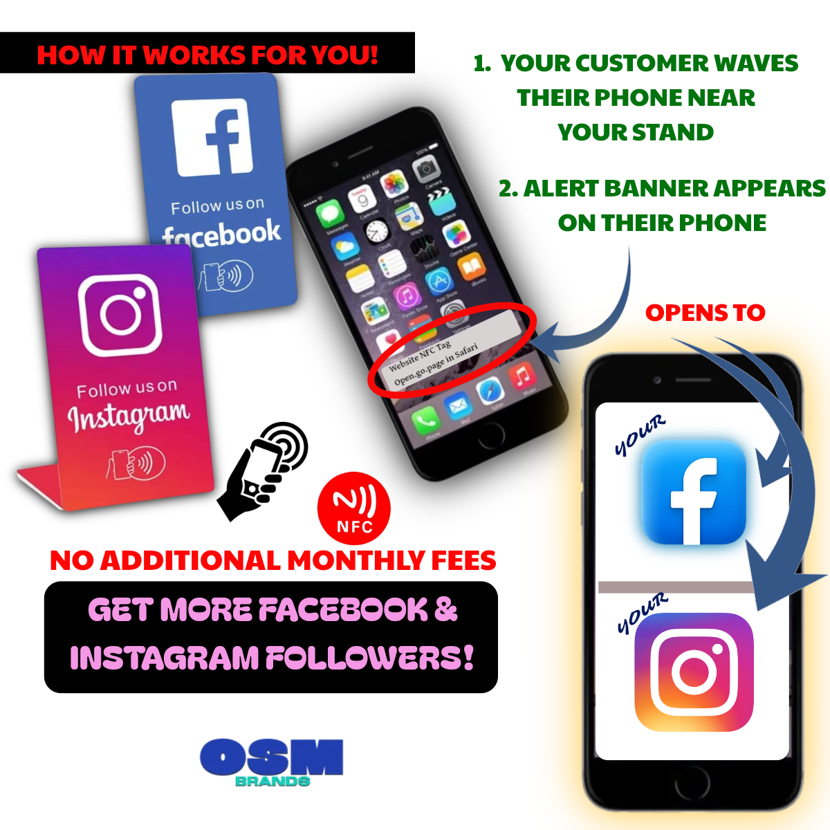 This affordable method offers you a game changing way to impress clients! Imagine your clients simply tapping their phone on this small countertop stand and your Facebook or Instagram page is instantly on their phone!