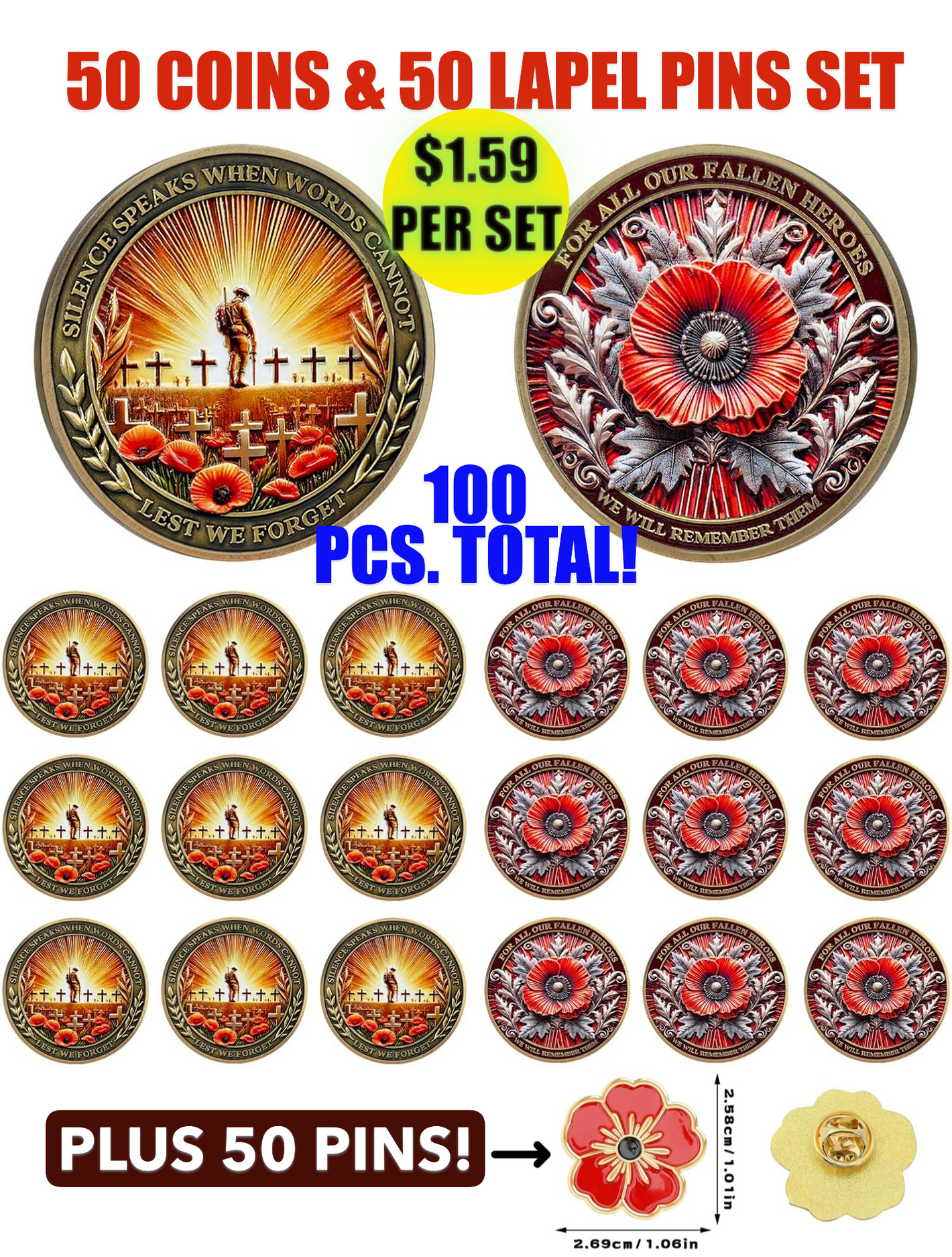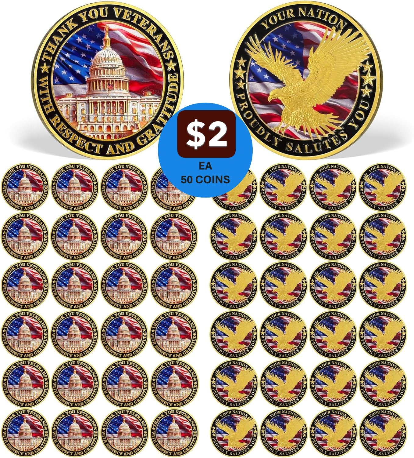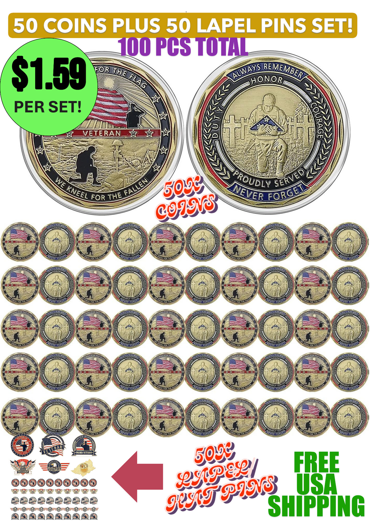 You will receive 50 US Veteran coins and 50 US Veteran Hat/Lapel Pins per order! Super savings deal!